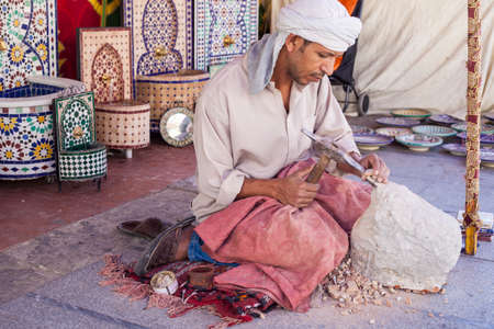Badajoz, Spain - September 24, 2016: Artisan makes pieces for mosaic craftwork. He is shaping pieces from glazed tiles