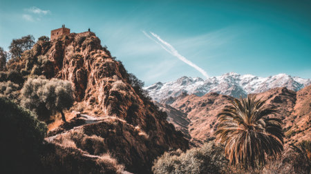 A beautiful landscape photograph of the rugged, reddish-brown Atlas Mountains. In the distance, majestic snow-covered peaks rise against a clear teal sky with a jet contrail.