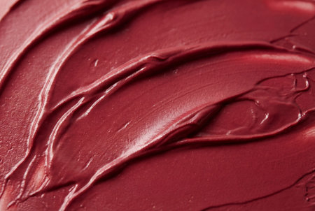Thick creamy texture of deep red berry lipstick smear featuring smooth artistic waves and a velvety finish suitable for elegant cosmetic and beauty product backgrounds.
