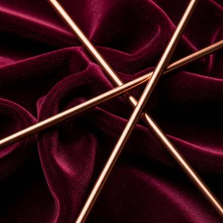 Golden knitting needles on red satin fabric background. Close up.