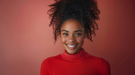 Close-up portrait of a beautiful young woman wearing a red sweater, smiling joyfully against a matching red background. Capturing natural beauty, happiness, and confidence.