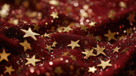 A mesmerizing close-up of golden stars scattered on a deep red fabric, creating a sparkling atmosphere perfect for festive celebrations and creative projects.