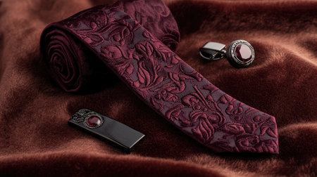 This image features an elegant burgundy tie alongside matching cufflinks and a tie clip on a rich textured fabric background, perfect for showcasing sophistication.