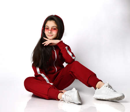 Trendy caucasian preteen girl model in fashion eyeglasses and tracksuit