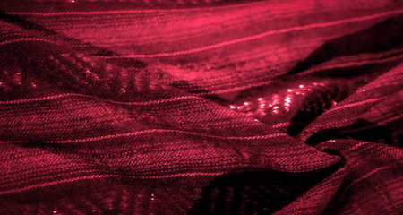 Blur of textured red fabric with shiny highlights and intricate patterns. The dynamic folds and subtle sparkle create an elegant and luxurious visual, perfect for fashion and textile presentations.