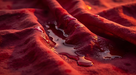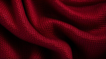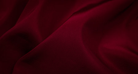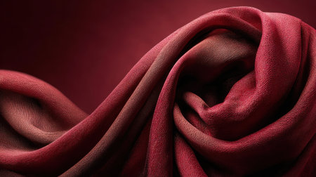 A rich, deep red fabric cascades elegantly against a softly lit background, highlighting its smooth texture and subtle color gradients that evoke a feeling of warmth and luxury.