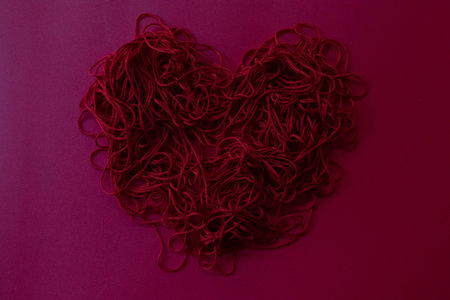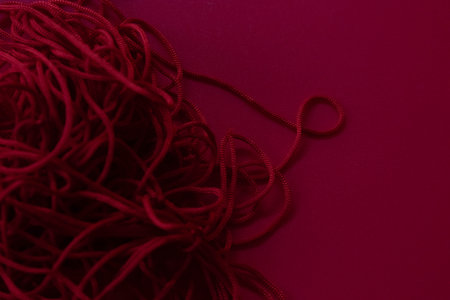 A heap of intertwined red cords spread across a deep magenta surface. The loops and twists form an intricate, abstract pattern that contrasts the smooth background