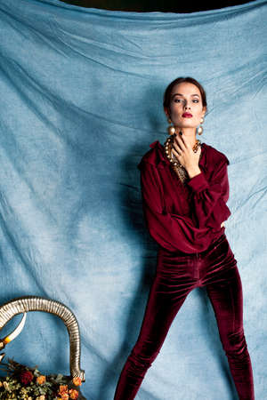 beauty rich brunette woman in luxury interior near empty frames, vintage elegance brunette stylish