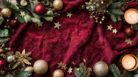 A rich red velvet fabric forms the background for a festive Christmas border, featuring pine branches, golden stars, red and gold baubles, and lit candles.