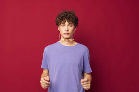 Young curly-haired man posing emotions close-up isolated background