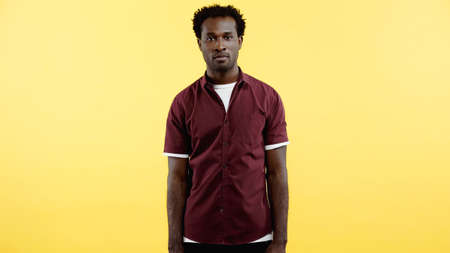 curly african american man in shirt looking at camera isolated on yellow