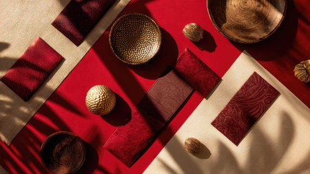 A stunning flat lay showcasing a blend of textiles, wooden bowls, and decorative elements arranged on a vibrant red and neutral background, emphasizing texture and color.