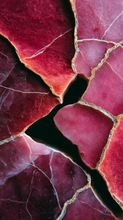 Fragmented view of burgundy marble showing cracked edges, layered pink surfaces and contrast with black inlay.