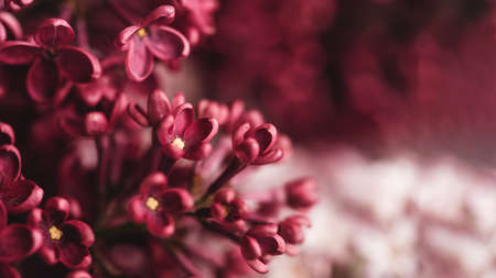 Beautiful lilac flowers background. Spring blossom. Purple lilac flower on bush. Bouquet of purple flowers, shallow depth of field. Happy Mothers Day greetings card. Copy space.