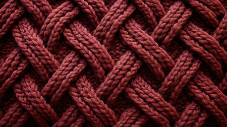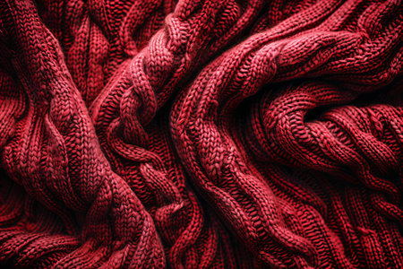 A macro shot exhibits the textural depth of a burgundy-hued knitted fabric, displaying intricate, folded layers and a visually appealing, high-contrast pattern of stitches.