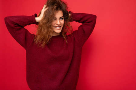 Shot of attractive happy smiling young woman wearing casual outfit standing isolated over colourful background with empty space looking to the side playing with curly hair