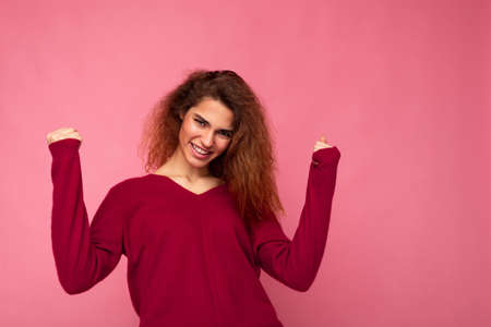 Photo of young emotional happy positive charming brunette curly lady with sincere emotions wearing casual pink pullover isolated over pink background with copy space and celebrating winning
