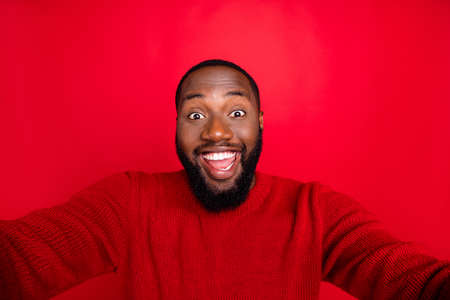 Close up photo of cheerful guy making selfie laughing wearing jumper isolated over red background