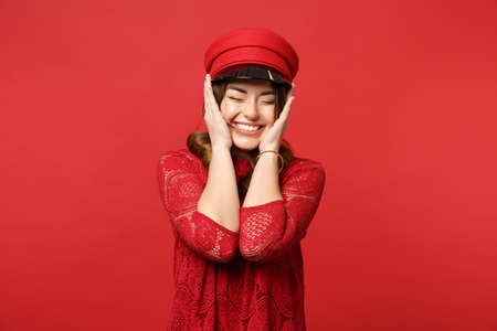 Portrait of smiling young woman in lace dress and cap keeping eyes closed, putting hands on face isolated on bright red wall background. People sincere emotions, lifestyle concept. Mock up copy space