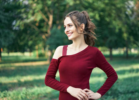 Portrait of young beautiful woman outdoors on green summer nature background. Female beauty concept