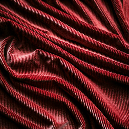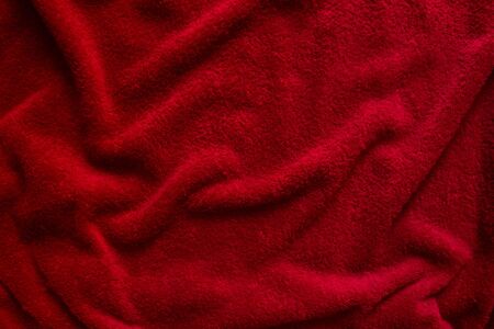 Texture of red velor corduroy fabric with folds.
