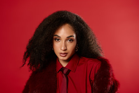 A stunning Black woman in a trendy autumn outfit poses confidently against a vivid backdrop.