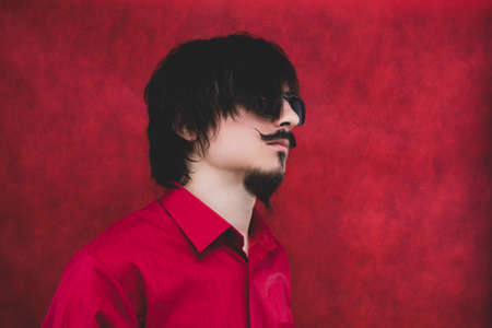 Young man with sunglasses in red shirt on the red background. male portrait