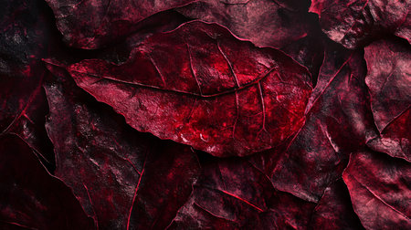 Foliage background in Viva Magenta. Red leaf top view