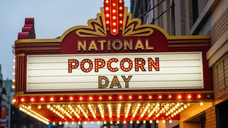 A classic cinema marquee announces national popcorn day with illuminated letters and lights. Bright sign for a celebratory event at an old theater.