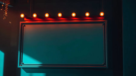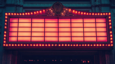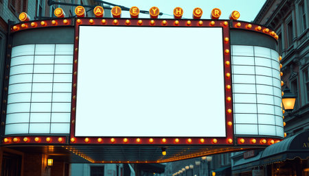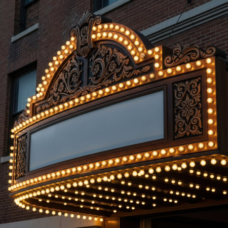 Captivating vintage theater marquee featuring bright illuminated bulbs and an empty space ready for upcoming show announcements, evoking nostalgia and creativity in entertainment.