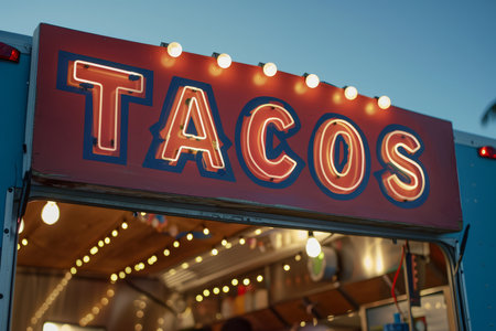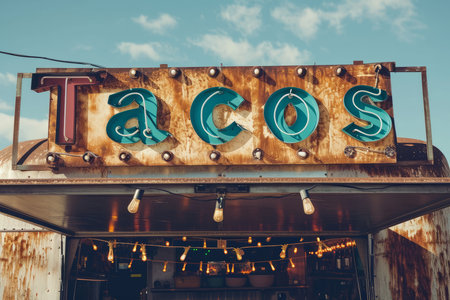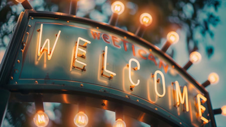 Inviting vintage neon sign welcomes visitors at dusk, surrounded by charming old fashioned light bulbs, creating a warm atmosphere for businesses