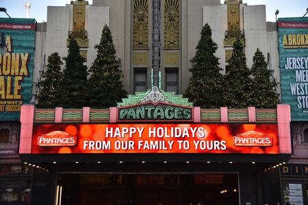 LOS ANGELES, CA/USA - November 24, 2018: Christmas trees adorn the marquee of the famous Pantages Theatre in Hollywood
