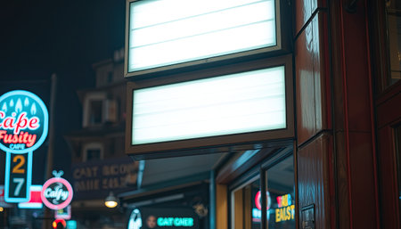 A nighttime photograph showing two illuminated blank signboards mounted on the exterior of a building.