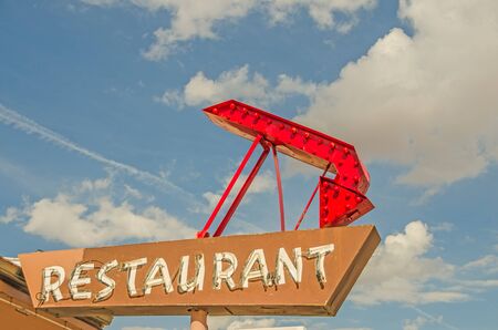 Generic restaurant sign with neon tubes on Route 66. The red arrow has bulbs in it.