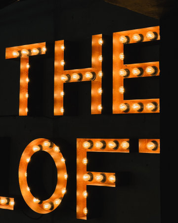 Glowing capital letters spelling The Loft emitting warm light, casting soft illumination against shadowy background, creating inviting nighttime signage atmosphere. Large illuminated letters The Loft