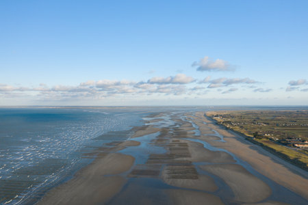 Aerial view of Utah Beach reveals intricate tidal flats, shallow water patterns, and a distant shoreline under a clear blue sky with scattered clouds. The landscape exudes openness and natural calm.