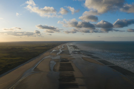 Drone view captures Utah Beach at sunset with dramatic clouds, reflective wet sand, and geometric oyster beds stretching along the shoreline. Soft golden light enhances the tranquil coastal atmosphere.
