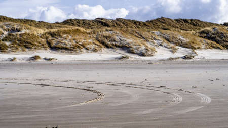 White sand dunes and dry grass on the shore with footprints on surface. Low angle landscape with bright cloudy sky at North Sea coast