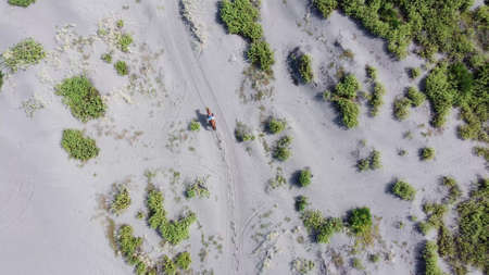 Adventurers on horseback through desert areas. Top View. Aerial drone view flight.