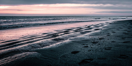 Soft waves gently lap at the shore as the sun sets on a tranquil beach, creating a serene atmosphere perfect for reflection and inspiration.