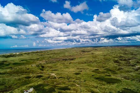 Dune landscape at the North Sea with view over the sandy beach and waving green helmet grass
