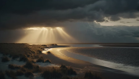 Serene showing winding river on a sandy beach at sunset with warm golden light keywords: river, beach, sand, water, ocean, sea, coastline, shore,...