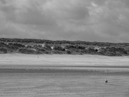 Walking on white sandy North sea beach near Zoutelande, Zeeland, Netherlands during low tide and thunderstorm