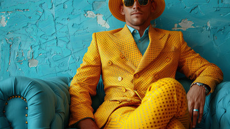 Fashion shot of a handsome man in yellow suit and sunglasses.