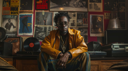 Portrait of afro american man in yellow jacket and eyeglasses sitting at table with vinyl records