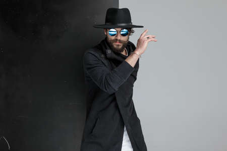 portrait of sexy young man in cool outfit with long beard holding arm up in a fashion manner on black and white background in studio