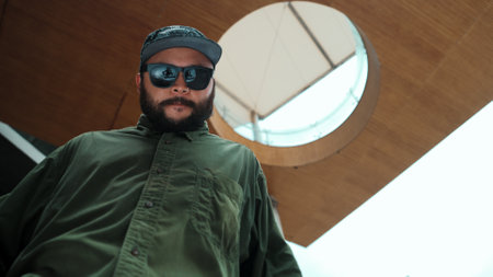 Portrait of a beautiful brutal tanned muscular hipster man in black shirt, hat and sunglasses posing in the streets of the European city