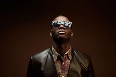 Portrait of African young man in stylish leather jacket and sunglasses posing on brown background