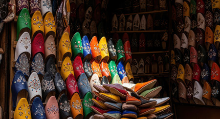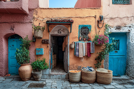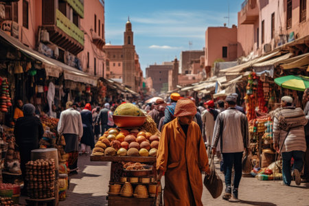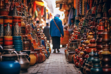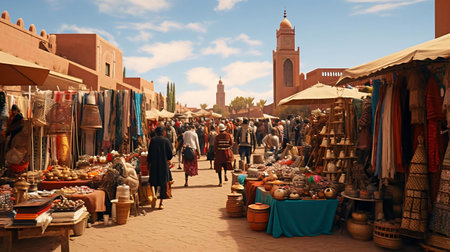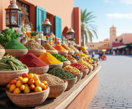 Street market in Morocco, with stalls full of colorful spices, woven baskets, and local artisans displaying their crafts. Generative AI