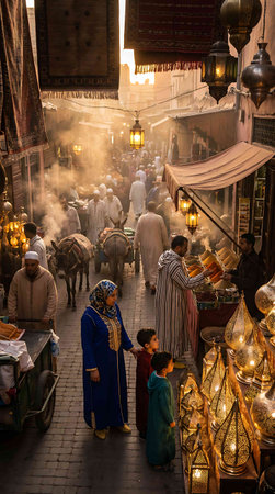 A vibrant street scene in a bustling Middle Eastern market at sunset